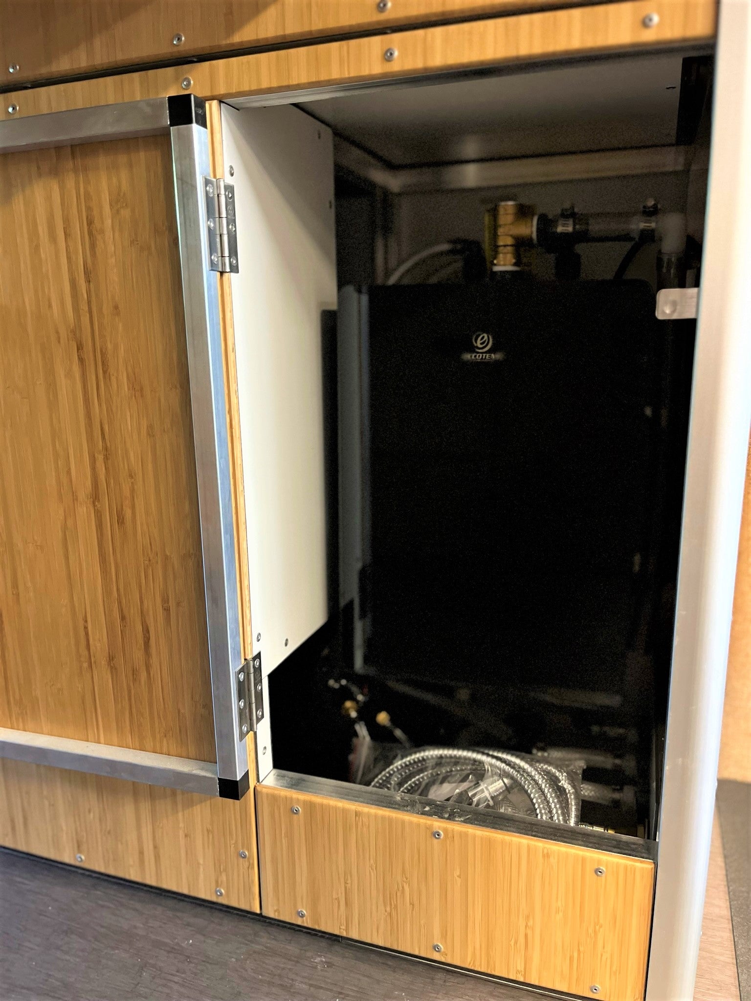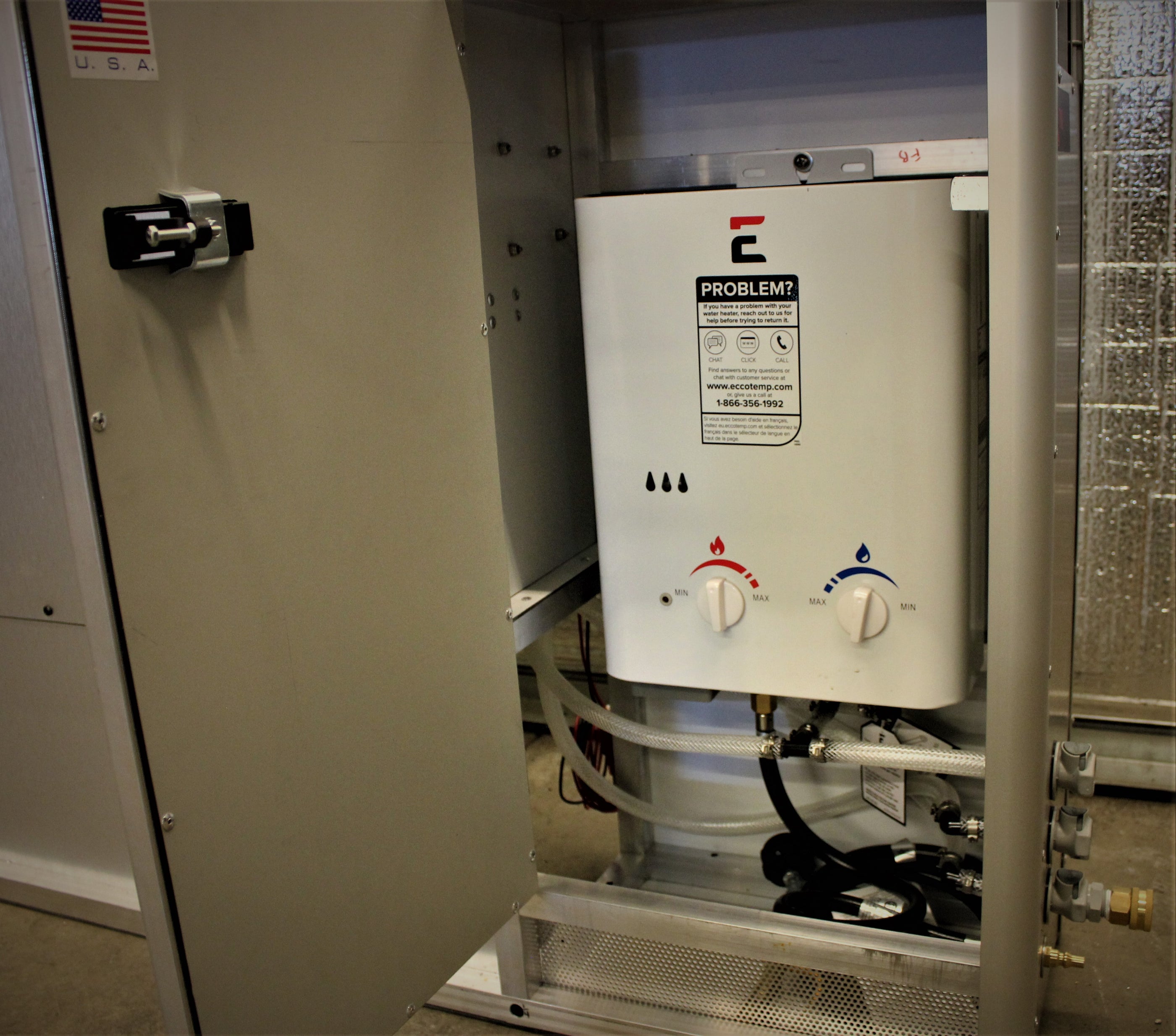 Our Systems can utilize both On Demand Propane Hot Water Heaters, as well as Electric Hot Water Heaters. Both options are great for providing hot water to your Galley or for shower set ups for your rig. These hot water heaters are mounted into a wheel well cabinet, and come standard with rear utility access for use off the rear of your rig.