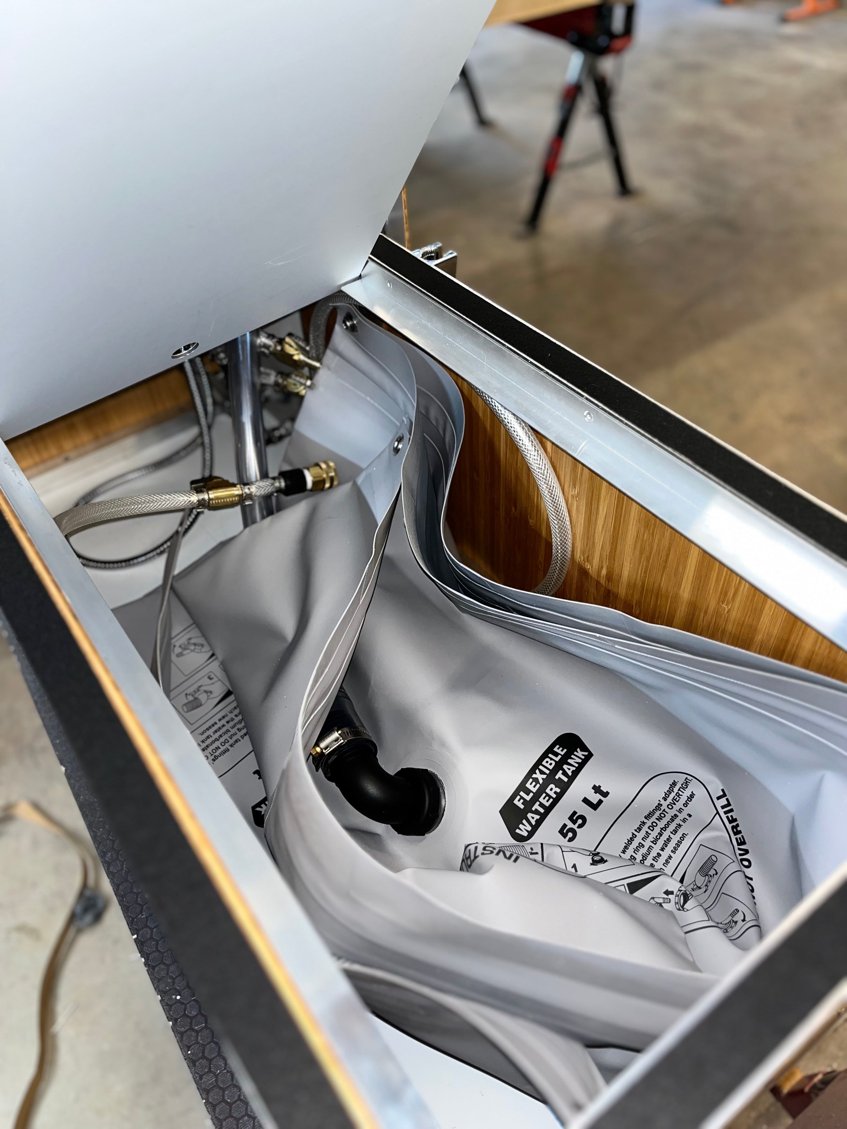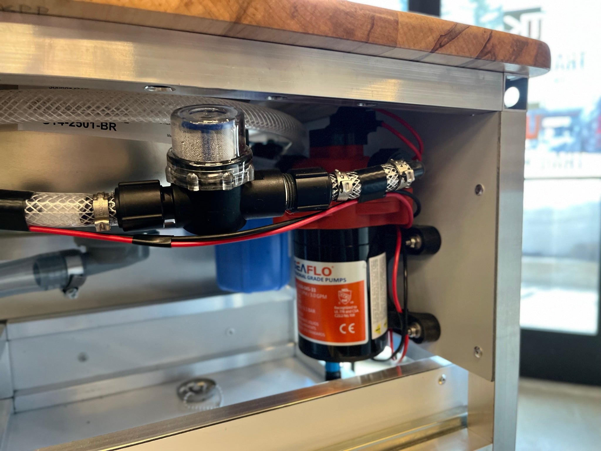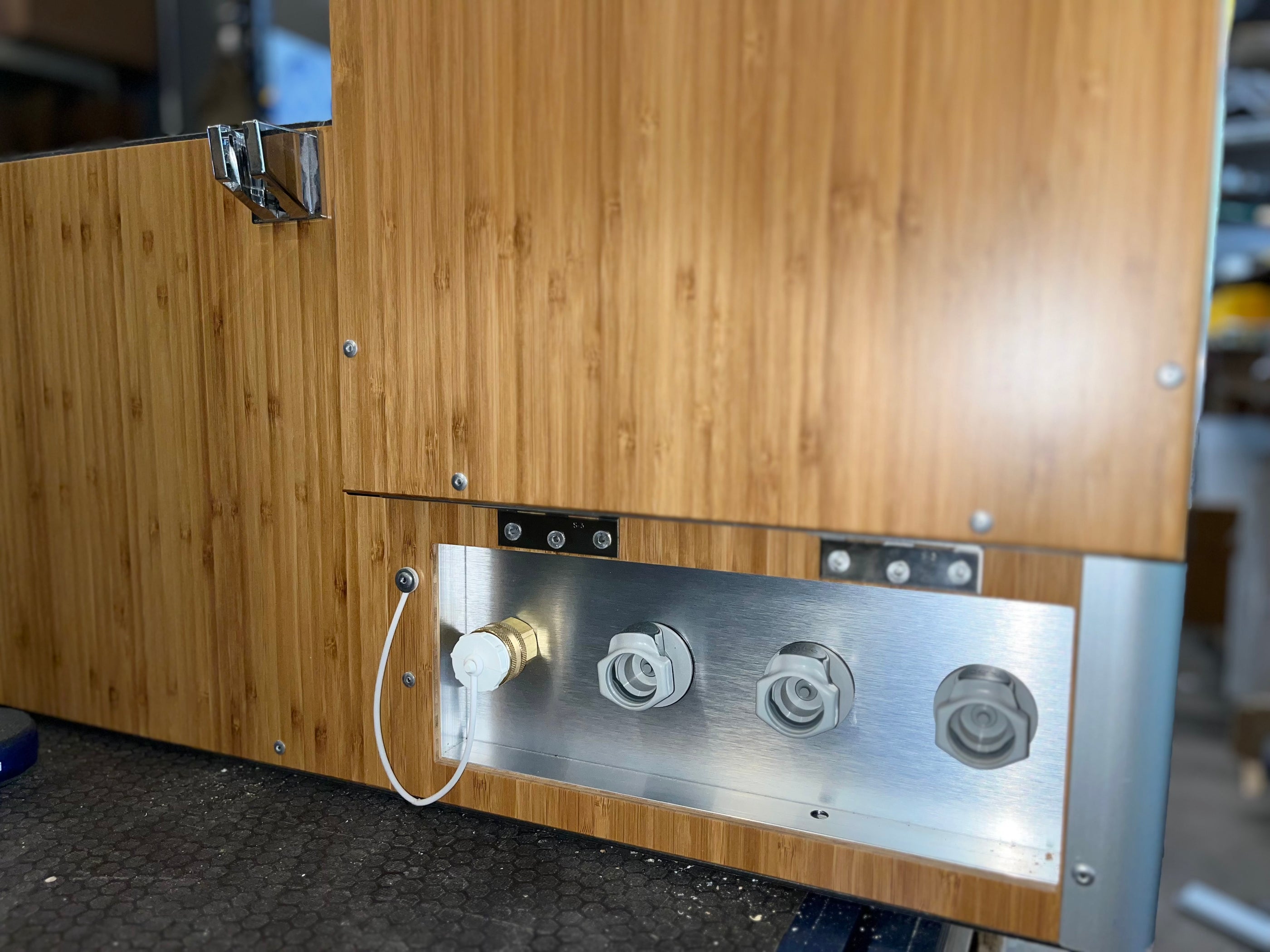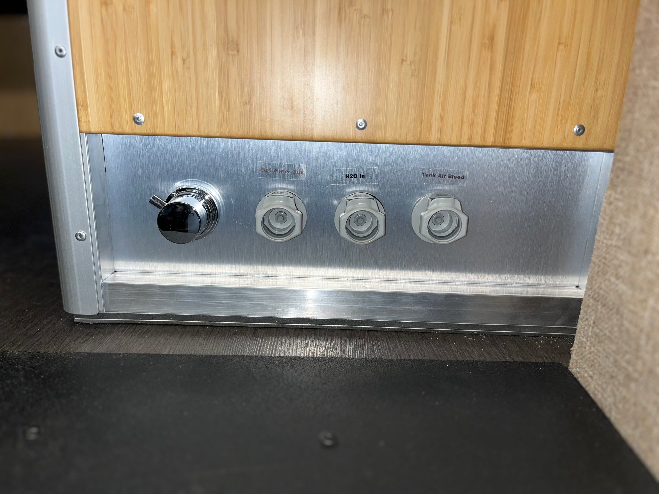 When Galleys and Wheel Well Cabinets are ordered together, units are pre plumbed for easy hook up and installation. If your system has a Hot Water heater, there will be a supply line for water to the heater and back to your faucet and other optional hot water output ports.