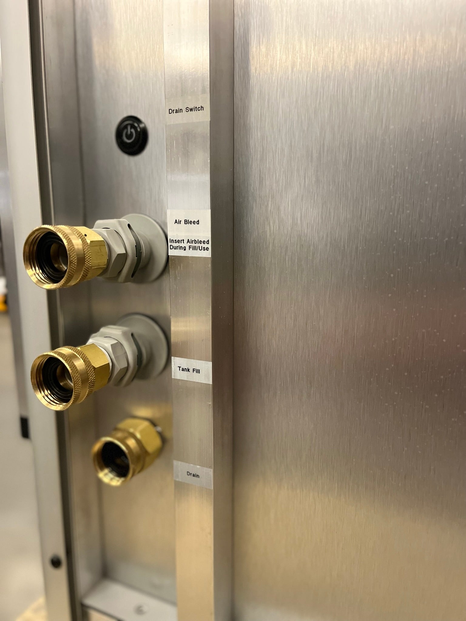 First locate your utility panel and find your Fill port as well as your Air Bleed port. You’ll want to purchase a dedicated freshwater hose to use for filling your system, and it's also helpful to use a scrap piece of hose for your air bleed requirements.. On one end of your freshwater hose, attach the provided quick release fitting that mates with your Fill port, and on the other you’ll want to leave the garden hose end so you can hook up to your freshwater source. You can do the same for your air bleed, but since this can be a scrap hose, you won’t need a fitting on the other end of this. Both the Fill and Air Bleed ports are valved fittings, these valves wont open until you insert the mating quick release fitting.
