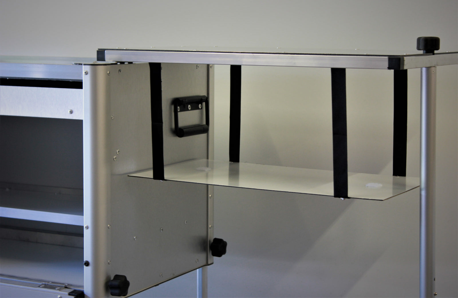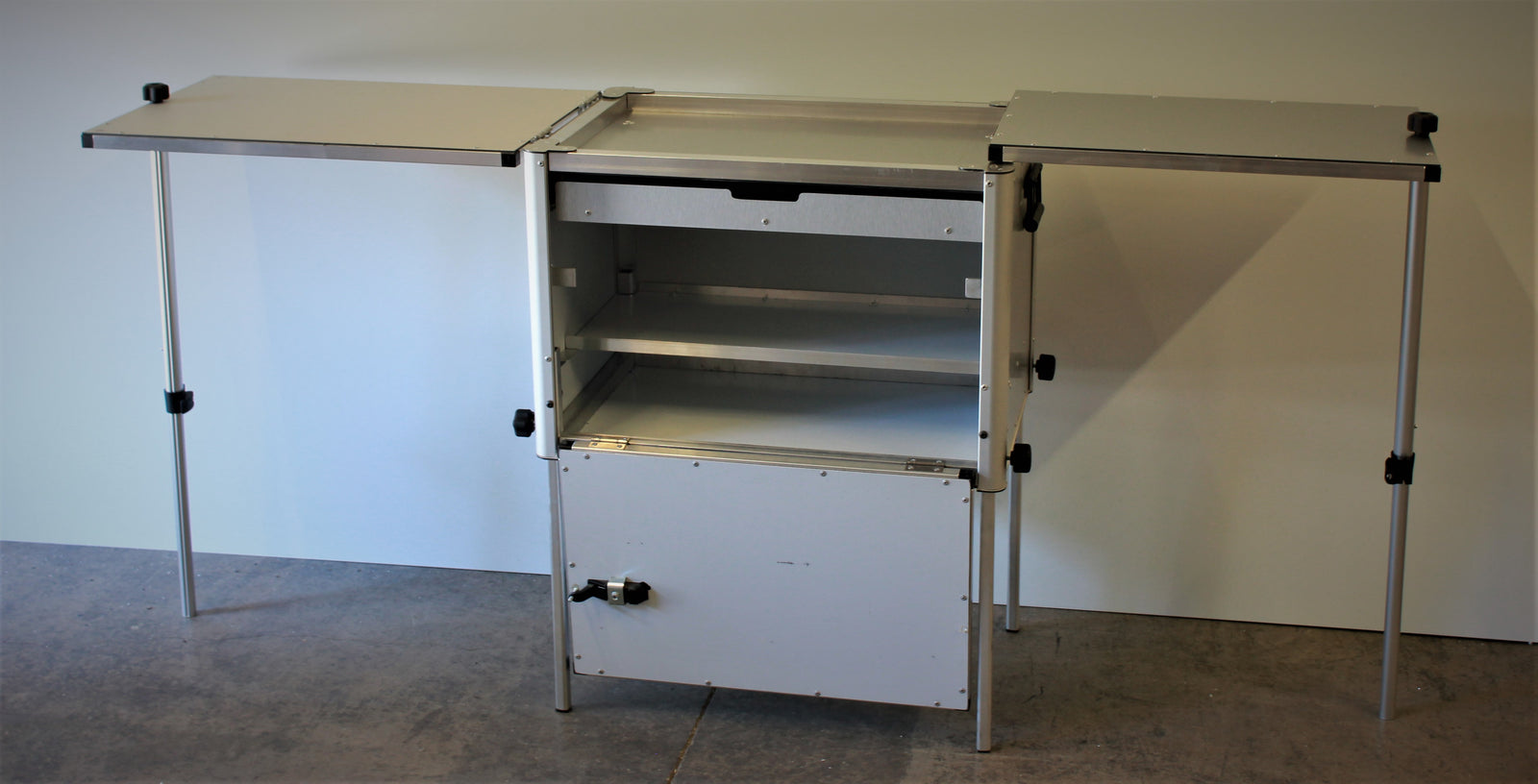 Premium Hand Made Camp Kitchen that Transforms from Storage to Outdoor Work Space. Standard Model Features Utensil Drawer w/ Organizer, Internal Divider Shelf, Two Fold Out Tables with Legs & Knobs, One Hanging Shelf, Four Main Legs & Knobs.